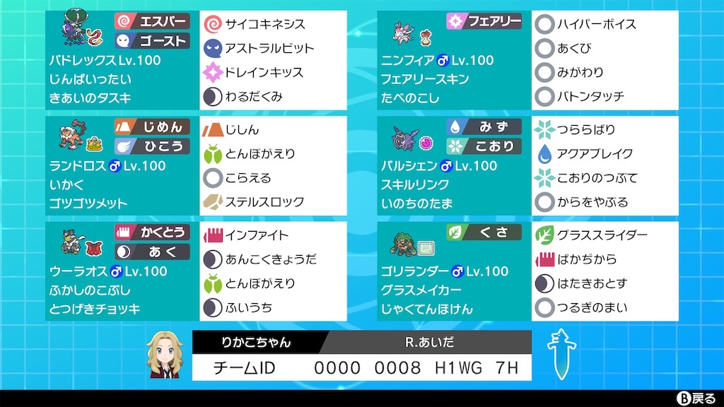 辺りが主であり、バドレックスが「悪巧み」を所持している場合+1回の行動保証で大体打ち抜ける実感があったため、フェアリータイプ且つ「欠伸」「身代わり」「バトンタッチ」を習得する等必要な要素をすべて満たしていたニンフィアを続けて採用。これを軸とした。